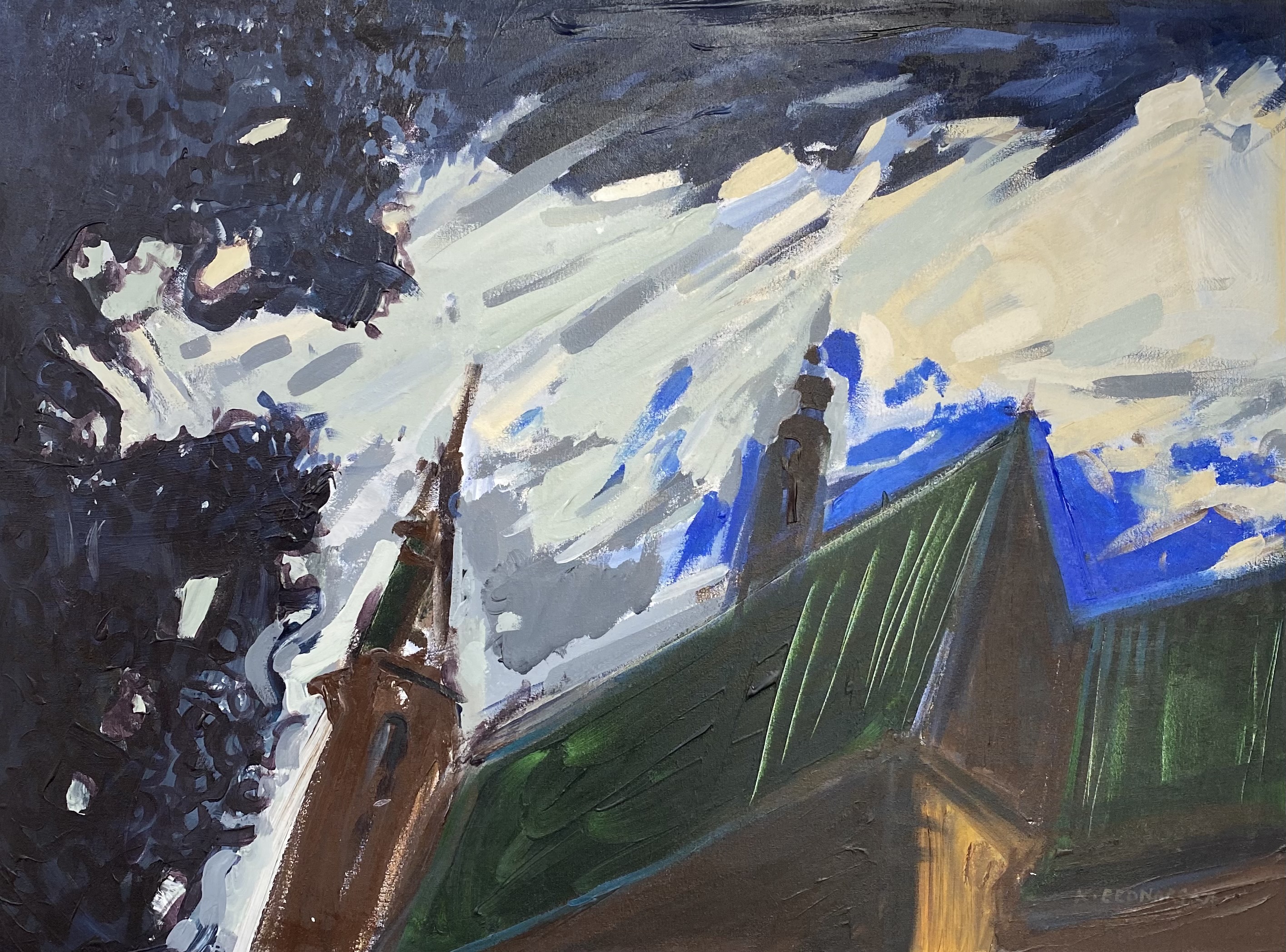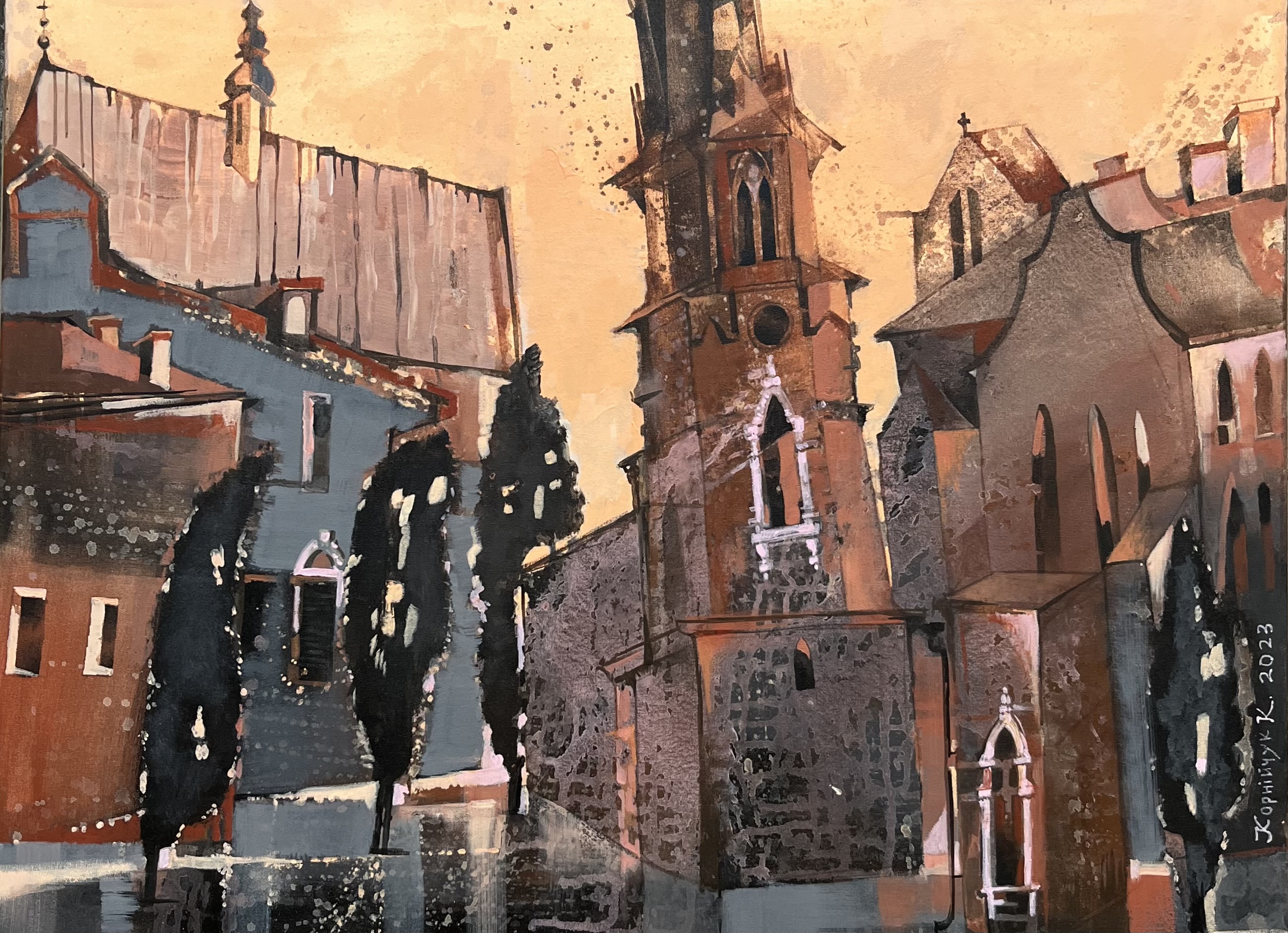 Oleksii Vakarchuk, Olkusz. Wieczór w mieście, akryl, 50 x 70 cm, 2023 r.